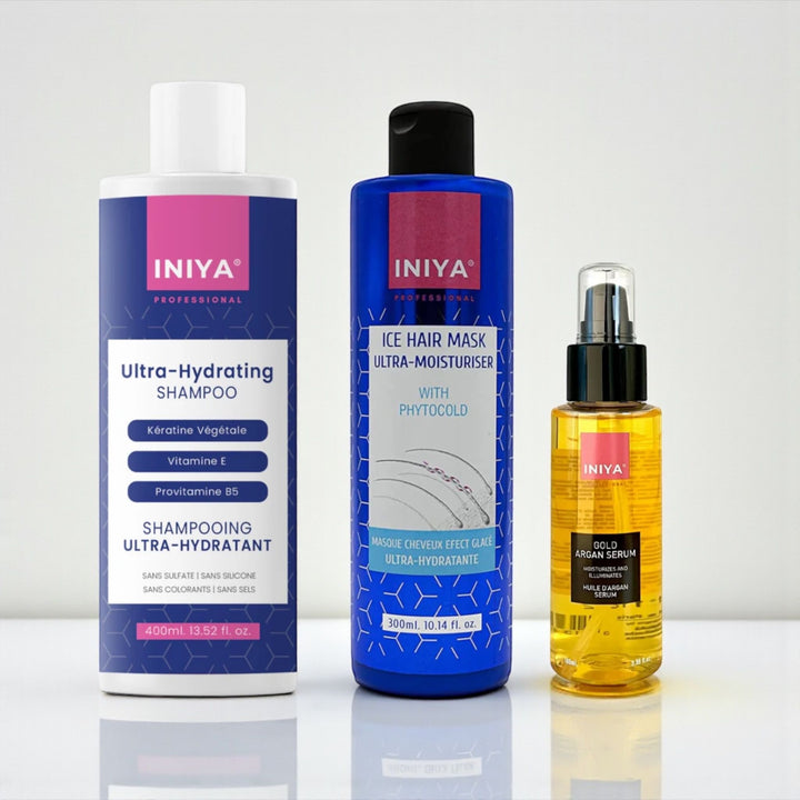 Découvrez le kit complet Ultra Hydratant INIYA Professional, conçu pour revitaliser, nourrir et réparer les cheveux secs, abîmés, déshydratés ou difficiles. Une routine professionnelle en 3 étapes : shampoing hydratant, masque ultra-moisturiser effet froid et sérum réparateur à l’huile d’argan.